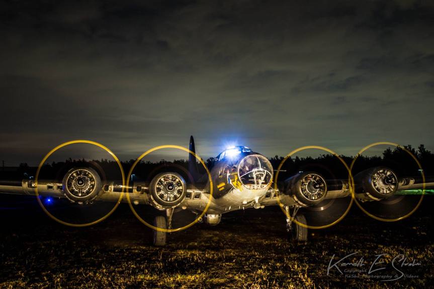 Night photo shoot of B-17 “The Movie Memphis Belle” Credit to Ken Strohm Share this: Click to share on Facebook (Opens in new window) Facebook Click to share on X (Opens in new window) X Click to email a link to a friend (Opens in new window) Email Like Loading... Related