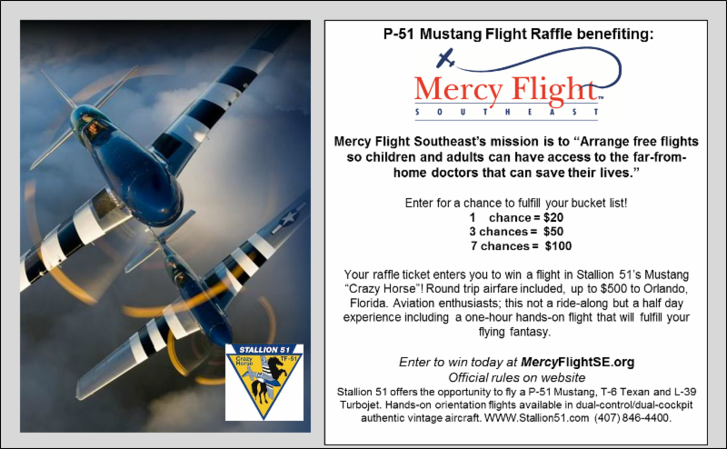 The winner of P-51 Mustang Flight will be announced LIVE from Stallion 51’s Hangar (KISM) on Mercy Flight Southeast’s Facebook Page. LIVE ON FACEBOOK SUNDAY 8:00 AM