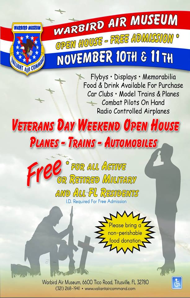 Open House, Valiant Air Command Museum, 10 and 11 November 2018 The Valiant Air Command is hosting an Open House on 10 and 11 November 2018. Free admission to all Military (active or retired) and Florida residents. Share this: Click to share on Facebook (Opens in new window) Facebook Click to share on X (Opens in new window) X Click to email a link to a friend (Opens in new window) Email Like Loading... Related