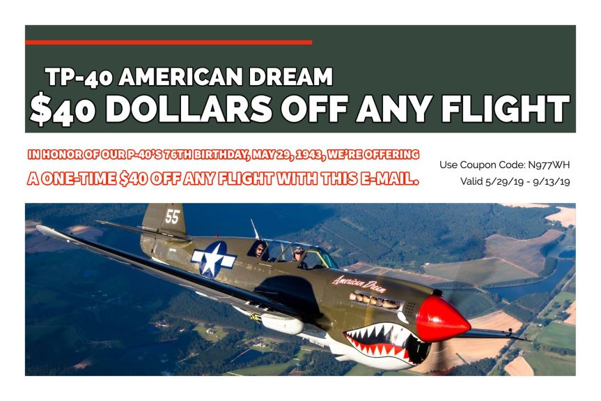 We celebrate her birthday by offering a coupon valid toward of any P-40 flight with us which is able to be applied from today until September 13th which was the day she was shot down during WWII.